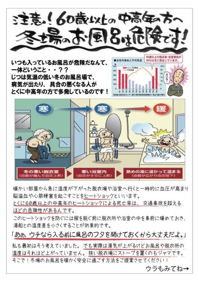 まだまだ、寒い日が続き温度変化により、血圧が高まりヒートショックを起こしやすい季節ですので、