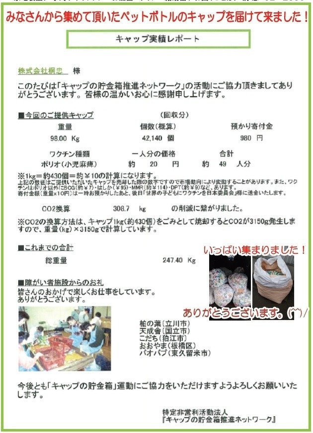 先日、みなさんから集めて頂いたペットボトルのキャップを届けて来ました! 重量98Kg、42.140個 約49人分のワクチンになりました。 そして、CO2換算すると…308.7KgものCO2の削減に繋げることができました。 たくさん、ありがとうございました!(^^)/