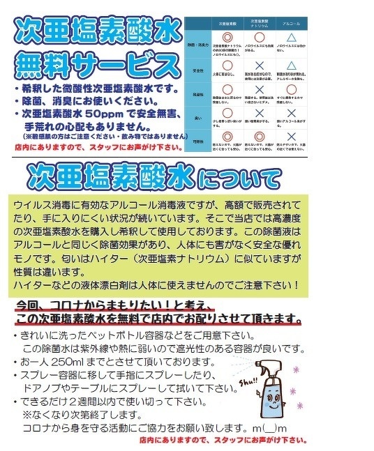 高濃度の次亜塩素酸水を購入し希釈して使用しております。